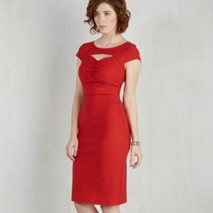 Mid-length Modcloth dress with a combo sweetheart/peekaboo neckline. I wore the dress for the photo, but it is 4 sizes too big on me. I can take measurements upon request. Zip up back runs upper 3/4 of dress, gathering on the bust, princess pleats in the back. Wrinkly from storage. Can steam prior to shipping if preferred. Red dress photos for overall fit reference only.