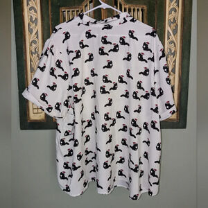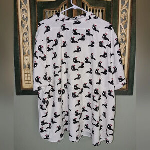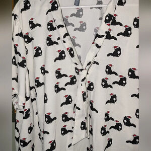 You knew this ivory blouse would fit into your holiday wardrobe, as soon as you saw how well it pairs with skirts, high-rise jeans, and slacks! Adorned with an exclusive, all over print of black cats wearing red Santa hats, along with an adjustable tie-neck detail and short flutter sleeves, this woven top is the perfect pick for Christmas, no matter what holiday festivity you’re headed to.