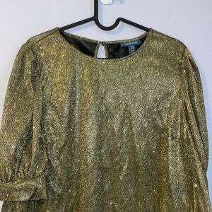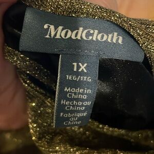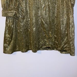 Modcloth Puff Sleeve Gold Metallic Too Glitzy To Function Glam Top Size 1X. Very good preowned condition. Glittery gold. Keyhole with button in back. See pictures for approximate measurements. Dress up or down.