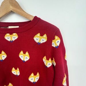 Charming red sweater with playful fox pattern. Crew neck design. Perfect for casual wear.
