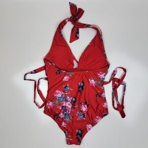 Modcloth Reese one-piece swimsuit. Red with multi-color floral print. Cascading ruffle accent. Halter neck ties behind neck. Ties around waist. Bust padding includes. No pilling or pulls in material. Excellent condition!
