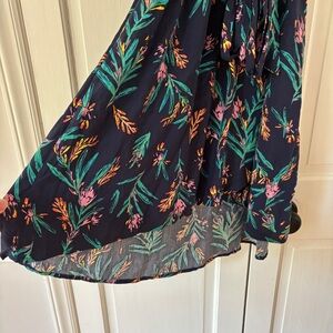 Feeling like your radiance has returned? Thank this fabulous faux-wrap dress, which embodies utter romance! Part of our ModCloth namesake label, this woven frock features whimsical flutter sleeves, a sash topping its elasticized-back waist, and a bright jade, orange, and pink floral pattern filling its navy blue backdrop with femininity. The below the knee length dress is made of rayon material and has a zip closure at the side as pictured. The hem is high low, so lower in front and longer in back! It is perfect for casual wear, a baby shower, a garden party, or when traveling during summer or spring! 100% rayon on navy lining and printed exterior! Preowned no flaws.