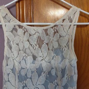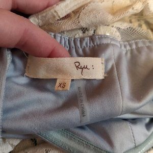 It is by Ryu (Modcloth/Anthropologie), and is a slate grey color with cream lace accents.