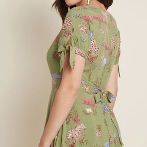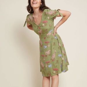 Your taste for 1940s-inspired pieces will be tickled once you're styled in this A-line dress! From our ModCloth namesake label, this woven beauty takes your look back - way back - with charming tied sleeves on either side of its V-neckline, adjustable waist ties, and an exclusive, hand-drawn print of colorful safari critters. Talk about a wardrobe treasure!