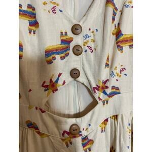 -Description: Modcloth linen dress, flowy & comfortable. Pinata print. Cutout on front of dress. Sleeveless and zipper back. 70% Rayon, 30% Linen. Pockets. It great condition!