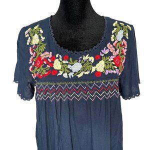 Pullover shift dress (fully lined), navy blue, beautiful embroidered flowers and embroidered lace details. 100% rayon.