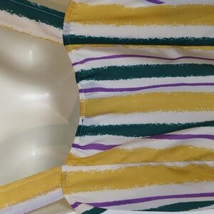 Yellow, purple, green, and white stripes. The buttons are each a different color that matches the shirt. Square neckline that folds over above the buttons. Unlined (slightly sheer). Excellent condition -- no stains, rips, or fraying. Laid flat pit-to-pit: 16in. Shoulder to hem: 25in.