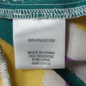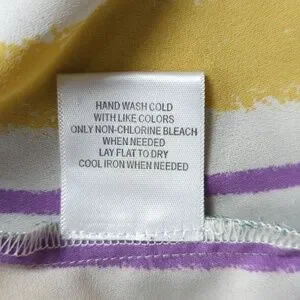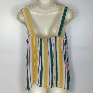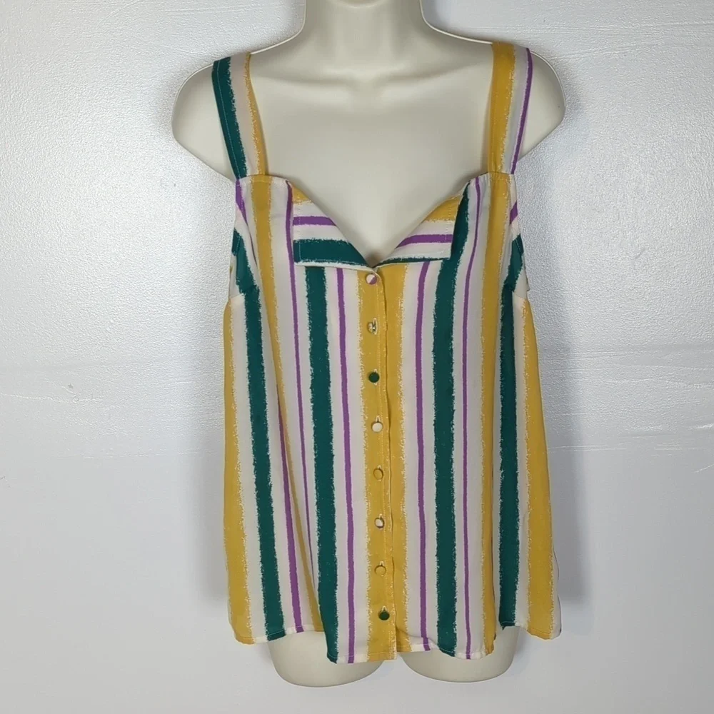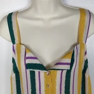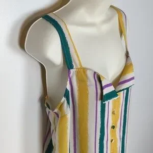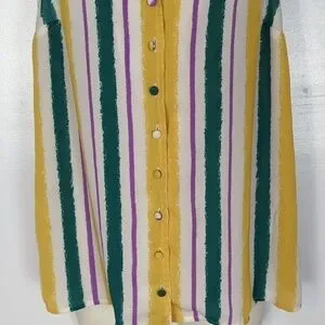 Yellow, purple, green, and white stripes. The buttons are each a different color that matches the shirt. Square neckline that folds over above the buttons. Unlined (slightly sheer). Excellent condition -- no stains, rips, or fraying. Laid flat pit-to-pit: 16in. Shoulder to hem: 25in.