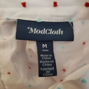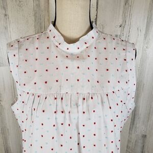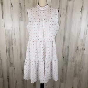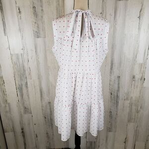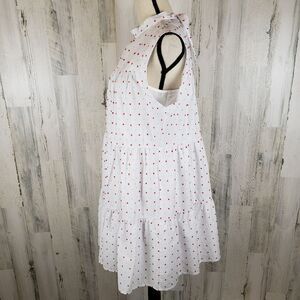 ~ Description: White with red and blue swiss dots, 100% cotton, non-stretch, white slip underneath, tie back, sleeveless, mockneck, tiered