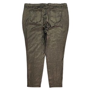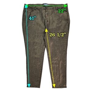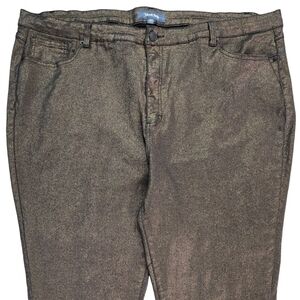 Good used condition, with no stains or tears. Stretchy bronze metallic skinny pants, with a high rise. Ankle length. Has the classic 5 pocket jean design, and a zip fly/button closure.