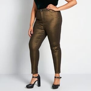 Modcloth The Hollywood Metallic Denim Skinny Pants Bronze High Rise Party