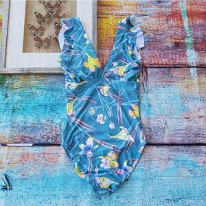 Floral 'the Kensie' one piece swimsuit by Modcloth. Teal style with yellow and white floral print. Deep V neckline with flutter sleeves and riched bodice. Full bottom coverage. In good condition. Made by Modcloth. There is no size tag but estimated to best fit a small.