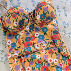 Modcloth The Pippa One Piece Swimsuit XS Yellow Floral Retro Bustier Corset 60s
