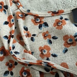 Great used condition. Top It Off Top by Modcloth in cream with orange and blue detailing. A versatile layering piece for the season, perfect to pair with a swimsuit or bralette. Lightweight semi-sheer top with fluttery short sleeves. Double functional front ties to cinch the waist with elasticized accents. Delicate floral print, see video. Stretchy fabric blend. Size small, see photos for measurements.