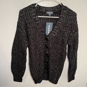 Great condition, new with tags. Modcloth. Warming signs knit cardigan. Black. This chunky, waffle stitch sweater is elevated by sparkly metallic threading, a long length, and button closures that lend a preppy, throwback vibe. Style #167399.