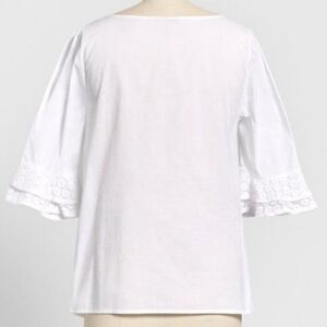 Modcloth It’s The Lace I Can Do Cotton Blouse White Size XS. Essential White cotton top. Tiered Ruffle Sleeves. Sheer Floral Crochet Lace Chest. Scoop neckline, Sweetheart neckline under lace. Bodice 100% cotton. Lace 70% cotton 30% nylon. Victorian Feminine Bridal Shower Daisy Flower Easter Bohemian Boho Peasant Americana July 4th of July Patriotic Coquette Shabby Chic T-Shirt Classic Closet Staple Spring Summer Beach Resort Wear. Length 24” Chest 18” Bottom opening 21” Gently used excellent preowned condition. Sharpie initials on fabric tag. See last photo for how i do measurements they are apprx and on one side.