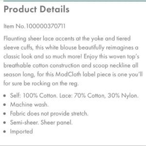 Modcloth It’s The Lace I Can Do Cotton Blouse White Size XS. Essential White cotton top. Tiered Ruffle Sleeves. Sheer Floral Crochet Lace Chest. Scoop neckline, Sweetheart neckline under lace. Bodice 100% cotton. Lace 70% cotton 30% nylon. Victorian Feminine Bridal Shower Daisy Flower Easter Bohemian Boho Peasant Americana July 4th of July Patriotic Coquette Shabby Chic T-Shirt Classic Closet Staple Spring Summer Beach Resort Wear. Length 24” Chest 18” Bottom opening 21” Gently used excellent preowned condition. Sharpie initials on fabric tag. See last photo for how i do measurements they are apprx and on one side.
