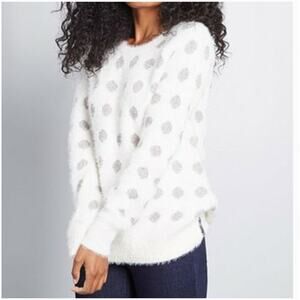 Modcloth White Small Sweater Polka Dot Eyelash Sparkle New Year's Cozy Rainbow