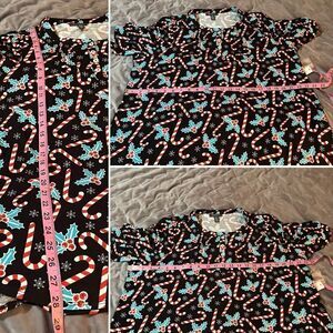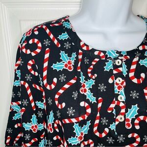 Modcloth Winning Them Over Short Sleeve Holiday Top Black Candy Cane Womens Size 1X NWT. Win the holidays in comfort and style! Vintage inspired top from ModCloth namesake label. Lightweight woven fabric. Darling black blouse boasts an exclusive hand drawn print of classic candy canes and holly berry tumbling with falling snow! Easy fit, short blouson sleeves, round neckline with Henley-style button closure, adorable pintuck design at front, retro-chic curved hemline. Quirky festive top. 95% Rayon, 5% Spandex. Machine wash. Runs true to size. Fabric provides stretch. Button closure at neckline.