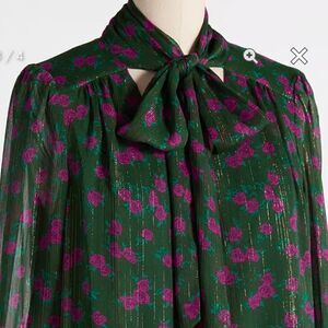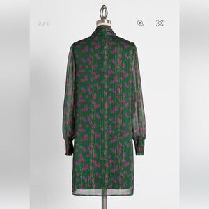 Modcloth Winter Blooming Roses Dress Tie Neck Shift Green Floral Size Small NWT. Holiday spirit back in time with 1970s inspired shift dress, semi-sheer billowing sleeves, tie neck. ModCloth namesake label, hunter green dress is bodice-lined, pink rose blooms. Subtle metallic shimmer woven into fabric! Shell: 100% Polyester. Lining: 95% Polyester, 5% Spandex. Machine wash.Fully lined except sheer sleeves. New with tags.