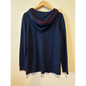 Modcloth Women's Hooded Holiday Sweater Navy Blue Red Mitten Pockets Xmas Size L