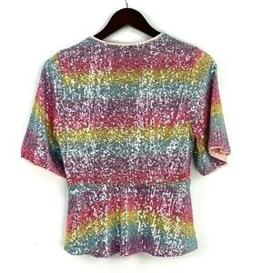Modcloth Womens Size M Wrap Rainbow Peplum Top Blouse Sequin Surplice Party E1