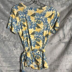 Modcloth Wrap Blouse with Tie Front Short Sleeves butter yellow bird print S
