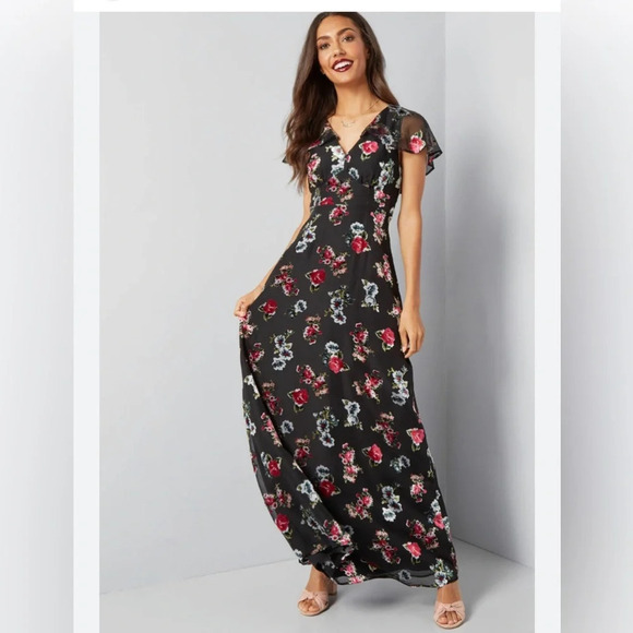Velvet burnout maxi dress with V-neck and flutter cap sleeves, no stretch, hidden underarm zip closure, empire and natural waist seams, shoulder and back flounce, black with multicolored floral design, lined.