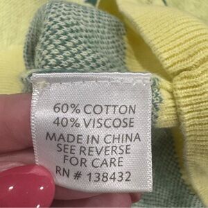Charming yellow sweater with green umbrella pattern. Short sleeves and crew neck. Perfect for casual wear.