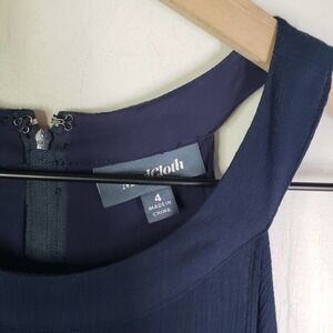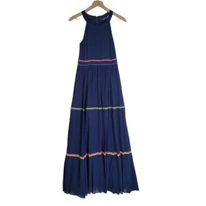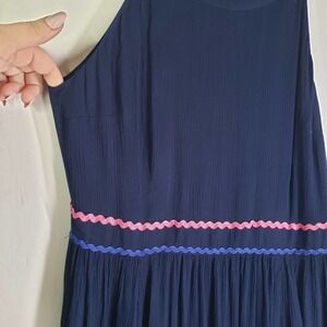 Key features: navy blue crinkle texture, colorful ric a rac trimmed tiers, sleeveless haler neckline, zip back, lined