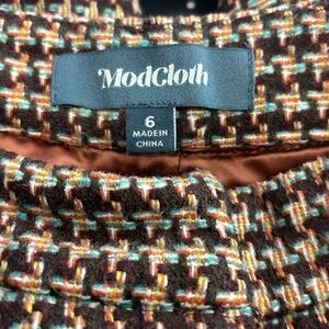 Modcloth Informed Ensemble Wide-Leg Pants. These brown wide-leg pants are decked in a chic houndstooth print. Made with a hint of wool, these vintage-inspired bottoms supply warmth and endless outfitting options. They are partially lined, have side pockets, and have a front zipper with a hook-and-bar closure. The fabric does not provide stretch.