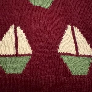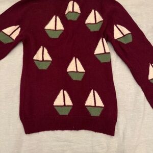 Cute quirky Modcloti cardigan, 100%. alpaca wool, which you can see on the tag, made in Bolivia. Size xs, oversized fit. Cute sailboat motifs and rich burgundy base tones. Nice weight and cozy but also not itchy . Have worn a handful of times; in excellent used condition with no piling !