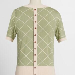 This stunning Bella Summer Harlequin Jumper is the perfect spring knit in a beautiful sage green and cream harlequin check. She’s a soft jacquard knit with a crew neck and short puff sleeves. This style is fitted to the upper hip so she’s great for tucking into a high-waisted skirt. A row of decorative wooden buttons down the back of the knit add a sweet final touch.