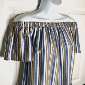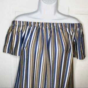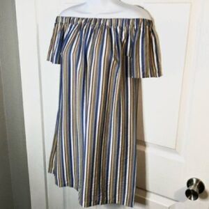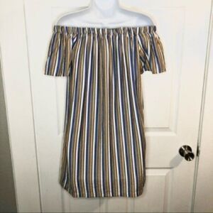 Modcloth Cape Cod Cutie Off Shoulder Mini Dress Stripe Blue Yellow White Brown Size Small. Relaxed fit. Lightweight. Short Sleeves Elastic band at top. Off the shoulder Festival Back to School Casual Beach Travel Resort Cruise Wear Boho Bohemian Nautical Sailing Sailor Sun Warm weather Spring Summer Fall Party Date Night Comfy Sundress. Measured 1 side: Length 28” from top of chest to bottom Chest 17” Waist approx 20” NWT