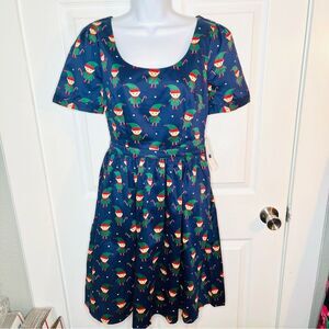 Modcloth Retro What's The Scoop? A-line Dress Christmas Elf Print Blue Size Size Small NWT Navy blue A-line dress full of whimsical charm. Hand-drawn print of adorable candy cane-toting elves dressed in festive red and green attire, short sleeves, gathered high-rise waist, and handy side pockets, A-line dress. 100% Cotton Machine wash. Runs true to size. Fabric does not provide stretch. Elasticized back panel at waist. Side pockets. Fully lined. Side zipper closure. New with tags.