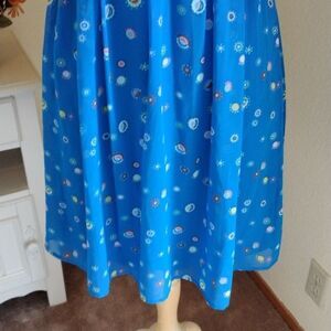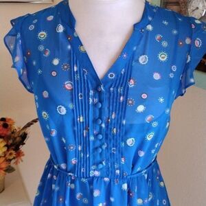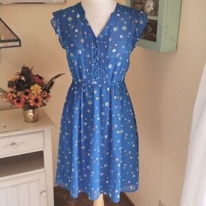 This cutie will be one of your favorites. Tucked bodice with covered buttons. Fluttery cap sleeves. Spaghetti ties around waist, Full gathered skirt. Attached blue slip. Size S/6 measures 36 at chest, 32 at waist, ties adjust, full skirt. 37 long from shoulder to hem. Super cute and ready for Spring.