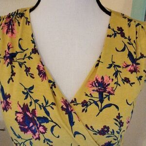 This gorgeous dress has the prettiest floral graphics. Mustard and purple floral with a sheer black hem. Wrap front, sheer long tie. Size S/0 measures 32 (2) at chest, 23-40 at waist, 44 at hips, 41 long from shoulder to hem. Such a unusual beauty!
