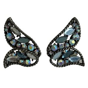 Mode Art Clip On Earrings Blue Silver Tone Aurora Borealis Rhinestone Vintage