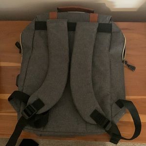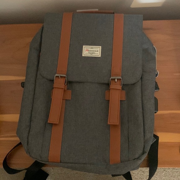 Grey Modoker backpack with USB port. padded laptop pocket and large interior section. This backpack does not have outside side pockets. 16x14x4.