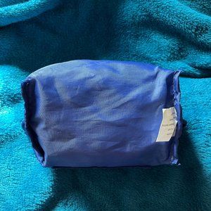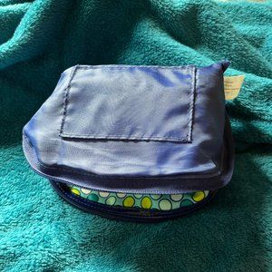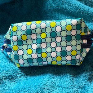 Cute makeup bag in teal with polka dots, medium blue interior. Nylon fabric. One small pocket inside, otherwise open for all of your pretty-making supplies and applicators. Good used condition.