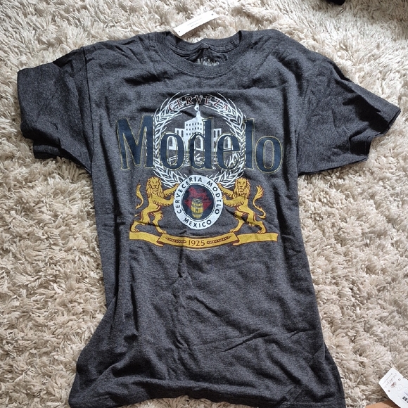 This Modelo short sleeve tee features a striking crest design on the front, set against a versatile gray backdrop. Crafted from comfortable cotton, it offers a classic crew neck fit perfect for everyday wear. Never worn.
