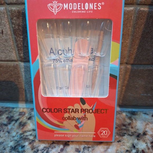 Modelones nail kit with clear nail tips. Includes 20 pieces. Vibrant red packaging.