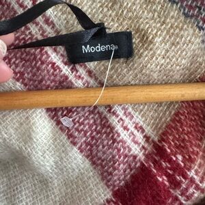 Soft and cozy Modena NYC Women’s Cape in plaid. Fleece feel knit with fringe edging. Clasps in front. New without tags