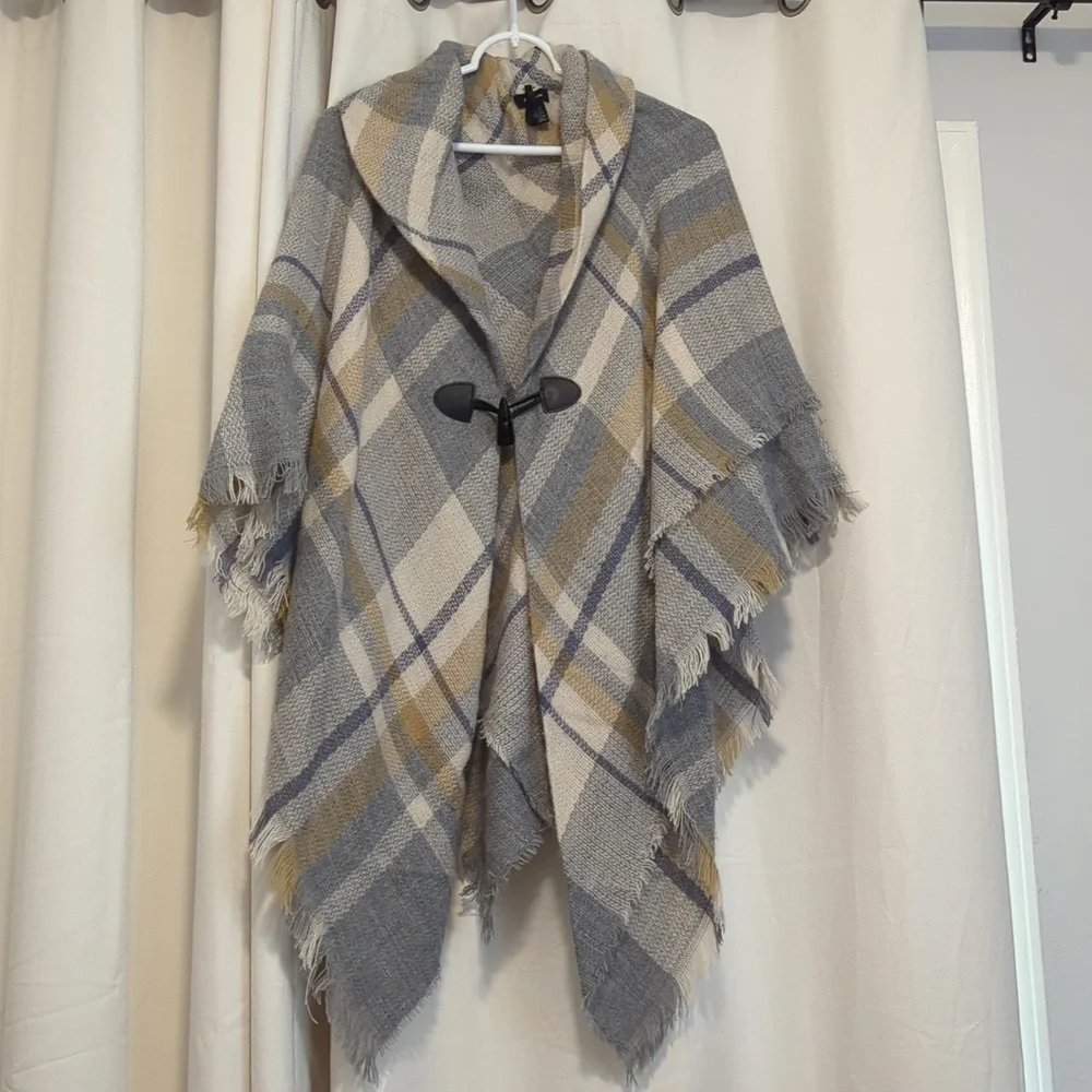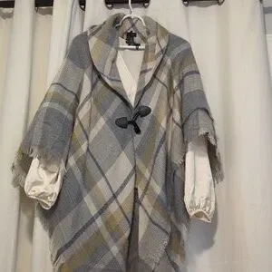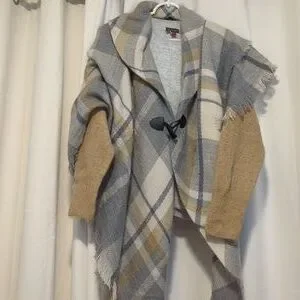 Not reversible. It is sewn at the top where it creates the collar. One Size. Fall/Winter. The material is very light. Plaid- Gold (or Beige), cream and Gray.