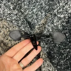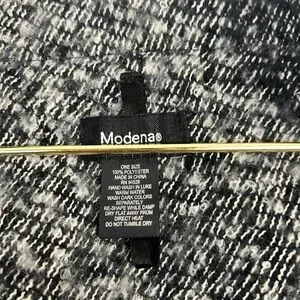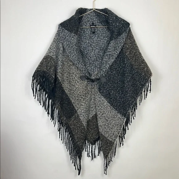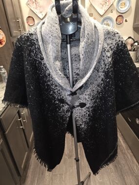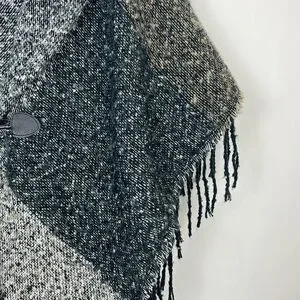 Modena plaid black and tan poncho, shawl, cape with fringe hem. Double layered with toggle button closure. Very soft and cozy; 100% polyester.