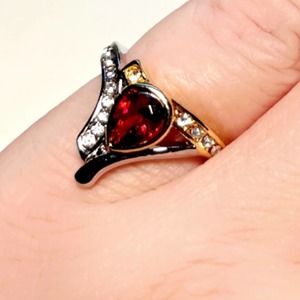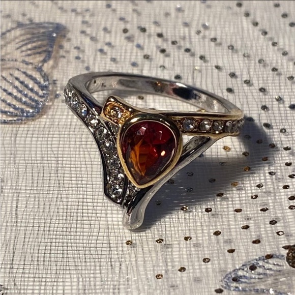 Unique silver and gold tone ring with red/brown crystal and white zircons.