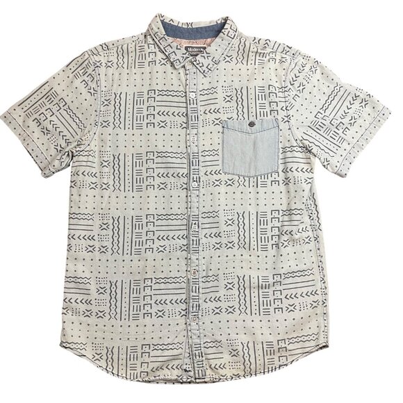 This men's button-up shirt from Modern Amusement showcases a geometric print in monochrome hues. It's tailored for a smart-casual look, suitable for various settings.