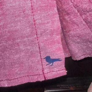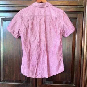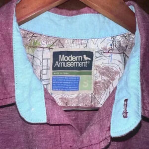 This is a men's short-sleeved button-down shirt by Modern Amusement. It is size S, made of 80% cotton and 20% linen. The shirt is maroon with a blue pocket and a blue inner collar. It is in pre-owned condition.