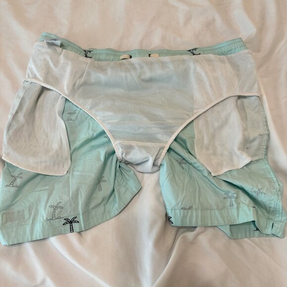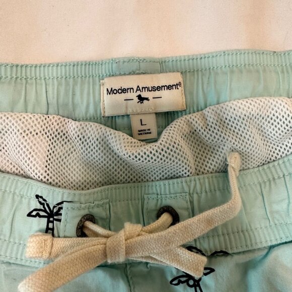 Dive into summer with these stylish Modern Amusement Men's Swim Trunks, showcasing a vibrant tropical pattern that's perfect for any beach day or poolside gathering. The size L trunks feature a refreshing aqua blue hue as the backdrop for a chic black palm tree print, offering a classic yet playful look. Crafted from a lightweight and quick-drying fabric, they ensure maximum comfort both in and out of the water. The trunks are designed with a comfortable elasticated waistband complemented by a cream drawstring that allows for a secure and adjustable fit. Plus, there's an easy-access back pocket with a hook and loop fastener to keep your essentials secure while you soak up the sun. Whether you're catching waves or relaxing on the sand, these trunks with their laid-back elegance are sure to be a go-to in your summer wardrobe.