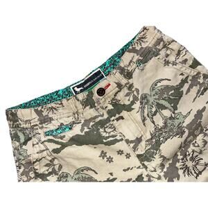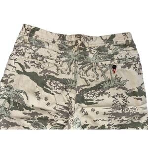 Elevate your casual wardrobe with these rare Modern Amusement shorts. Featuring a unique palm tree camouflage pattern in khaki, they are perfect for any casual occasion. The shorts come with a zip closure and have a waist size of 31 inches with a 10-inch inseam.
